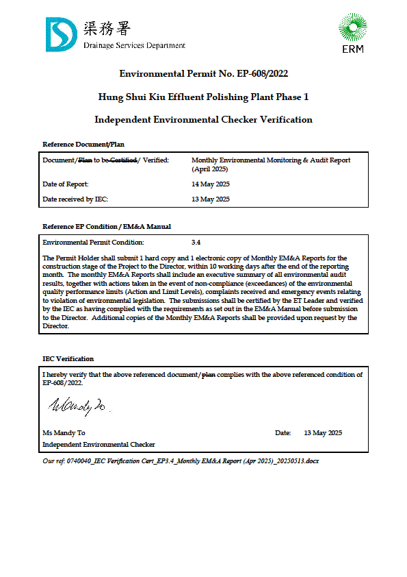 The Environmental Impact Assessment (EIA) Report and its Environmental Monitoring and Audit (EM&A) Manual (Register No. AEIAR-240/2022) for HSKEPP was approved on 19 October 2022, with an Environmental Permit (EP) granted on 19 October 2022 (EP No. EP-608/2022) under the Environmental Impact Assessment Ordinance (EIAO).