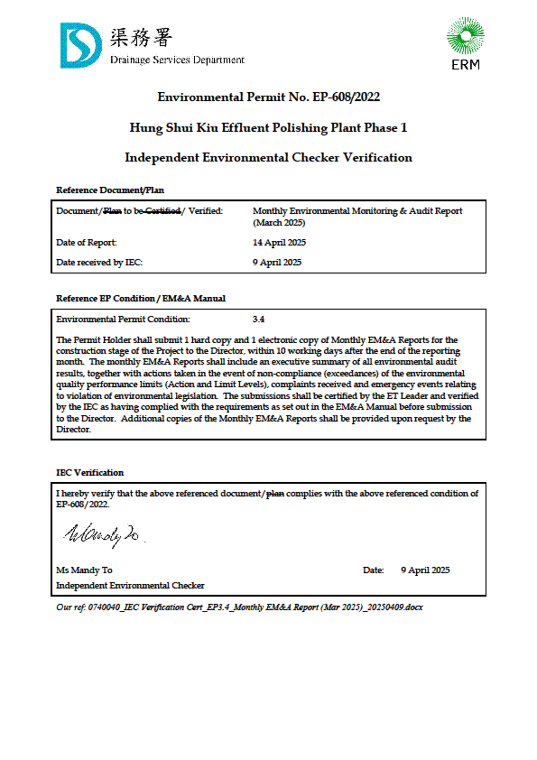 The Environmental Impact Assessment (EIA) Report and its Environmental Monitoring and Audit (EM&A) Manual (Register No. AEIAR-240/2022) for HSKEPP was approved on 19 October 2022, with an Environmental Permit (EP) granted on 19 October 2022 (EP No. EP-608/2022) under the Environmental Impact Assessment Ordinance (EIAO).